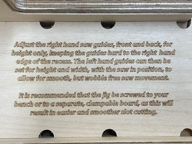 Instructions for use and adjustment are laser engraved onto the jig itself so there is no paperwork to lose.