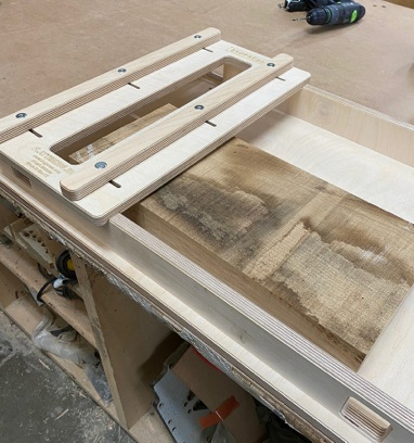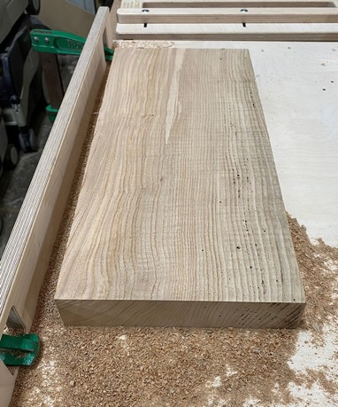 The slab of rough sawn timber is screwed to the base of the jig from underneath and the corners can be packed out to increase stability if required.