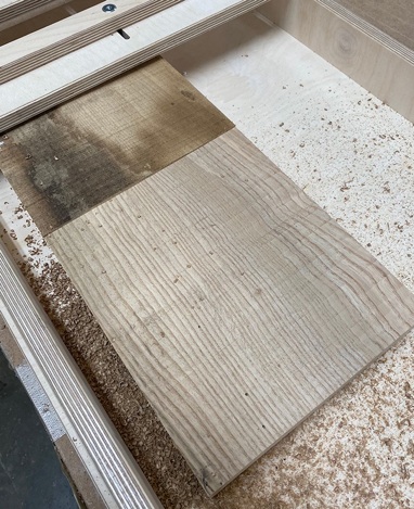 The surface will still need to finally cleaned up with a hand plane or sander but it is now perfectly flat and of uniform thickness.