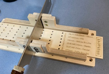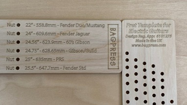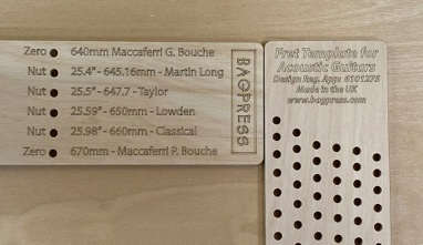 The accuracy of the template drilling has been independently assessed as being slightly better than that of the metal StewMac products and allowance is even made for scale lengths that usually incorporate a Zero fret, as is the case with those for the Maccaferri guitars.