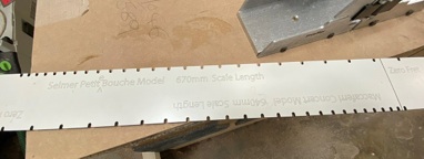This was fine for my first two guitars which were built on the Martin 25.34” scale. However, when I wanted to build a Maccaferri copy, I had to CNC machine my own scale template as the Maccaferri scales are not available from StewMac or any of the other suppliers of similar jigs.