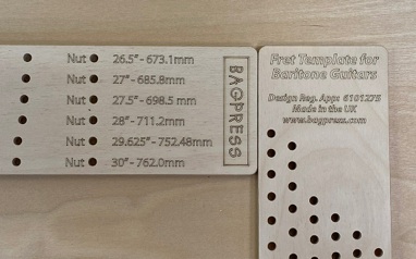 As well as the standard mixed electric/acoustic template there are four others available covering electric, acoustic, baritone and bass scale lengths. I believe this is the most complete set of templates available for any fret slotting jig currently being made and covers more than 20 different scale lengths.